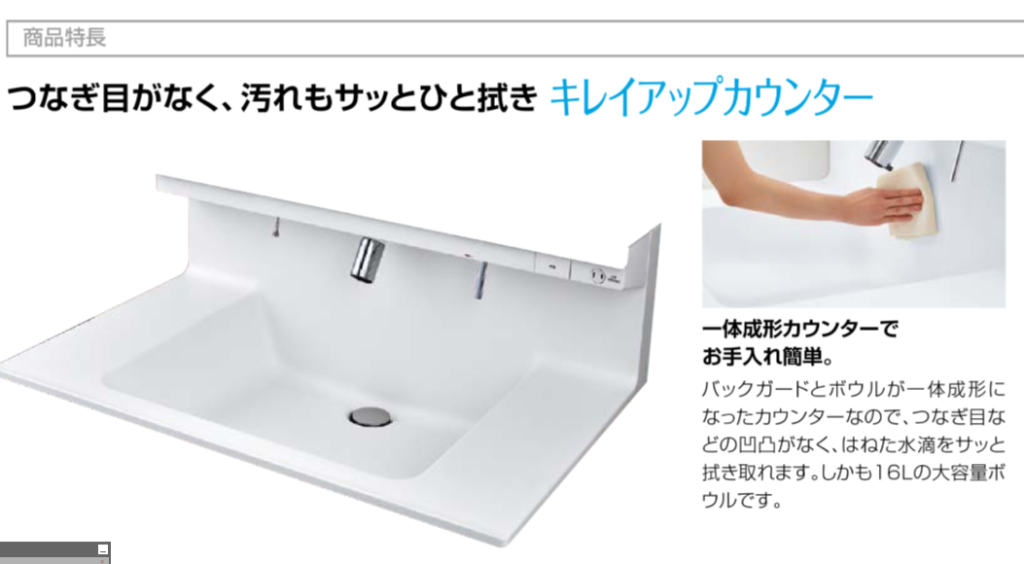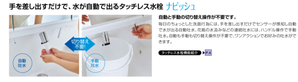 ナビッシュというタッチレス水栓機能が付いており、手を出すだけで自動でお水が出てきて