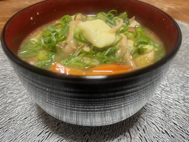 ③・Aを加えて煮、火が通ったら、①のほうれん草を加えてひと煮します。みそを溶き入れ、器に盛り、小ねぎを散らし、お好みでバターをのせます。