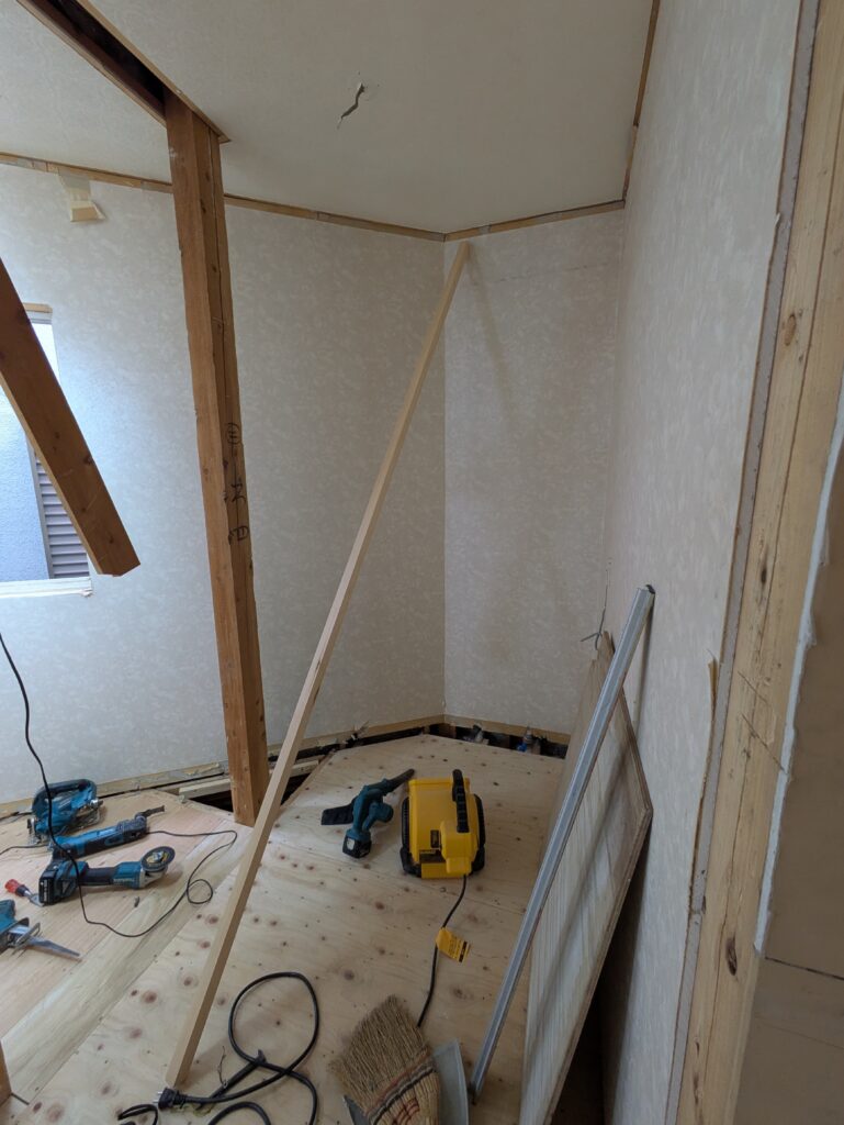 既存壁面を撤去、床の下地補修、配管を移設しました。