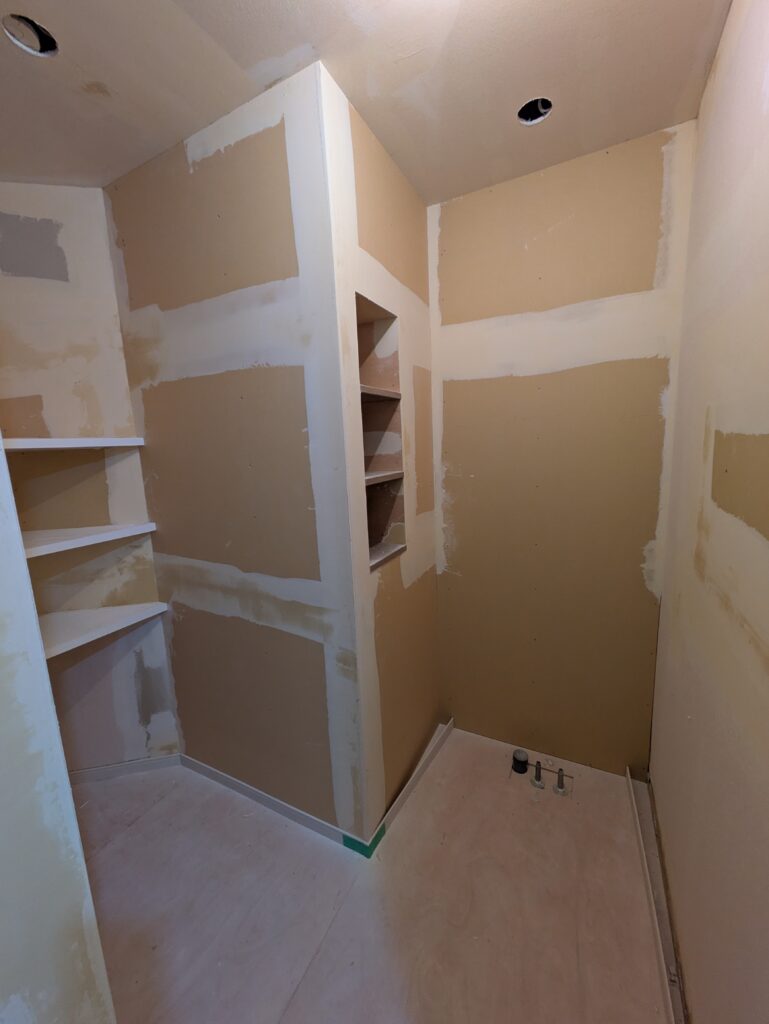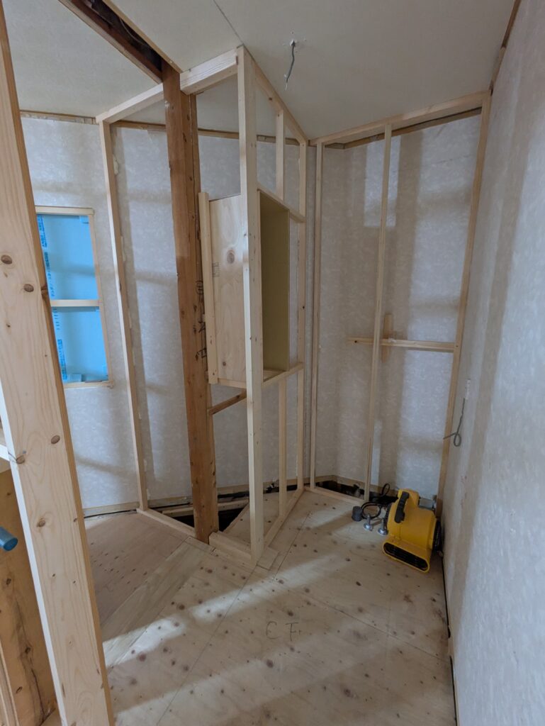 新しい洗面化粧台に合わせて、下地を組み、壁紙を貼れる状態に。