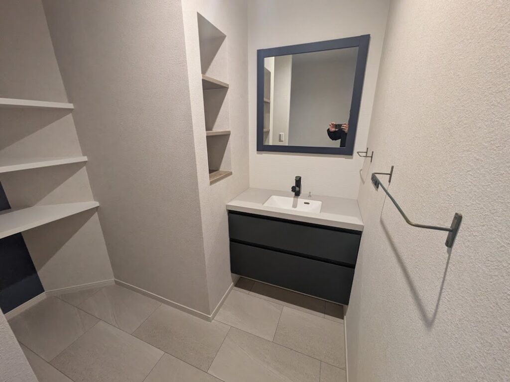 壁紙・床材を貼り、洗面化粧台を取り付けて完成です。