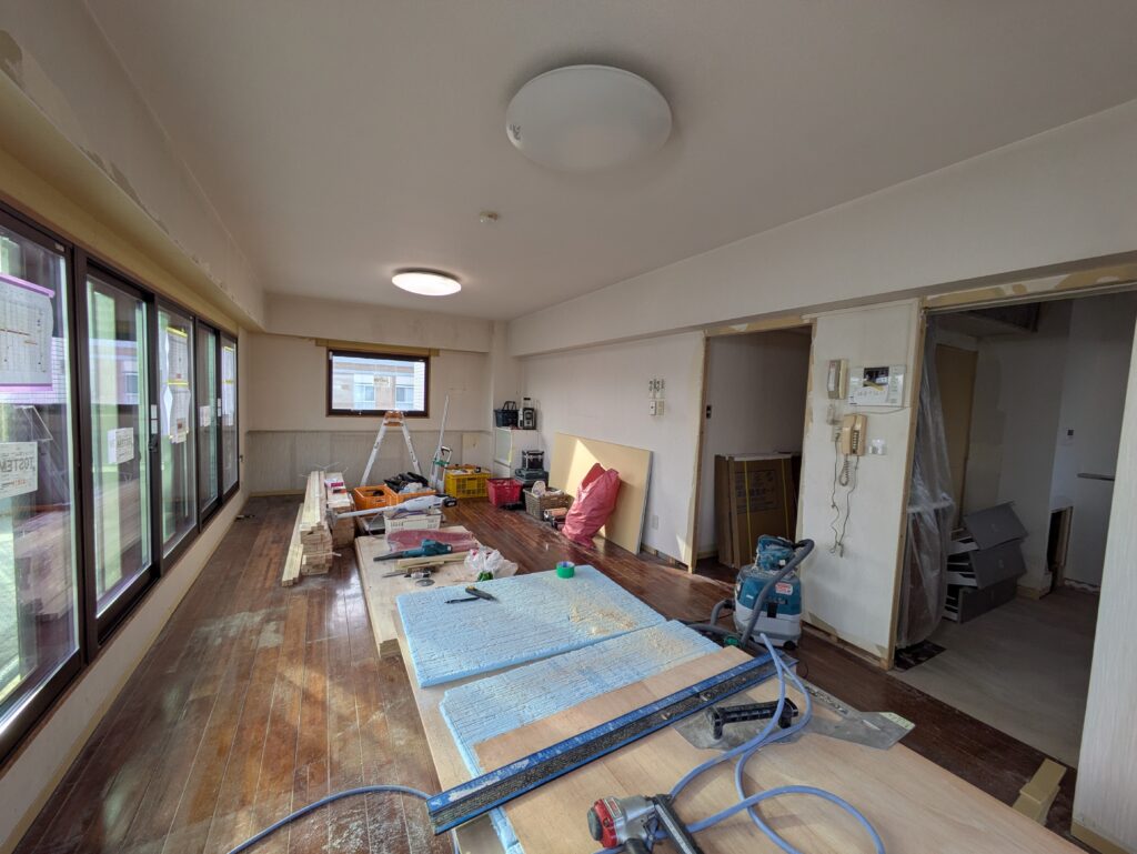 既存の15mm無垢材フローリングの上から新規で12mmのフローリングを貼っていきます。