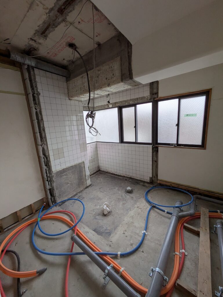 解体工事も無事に終わり、新たにユニットバスを設置する位置に新規で設備配管を行います。