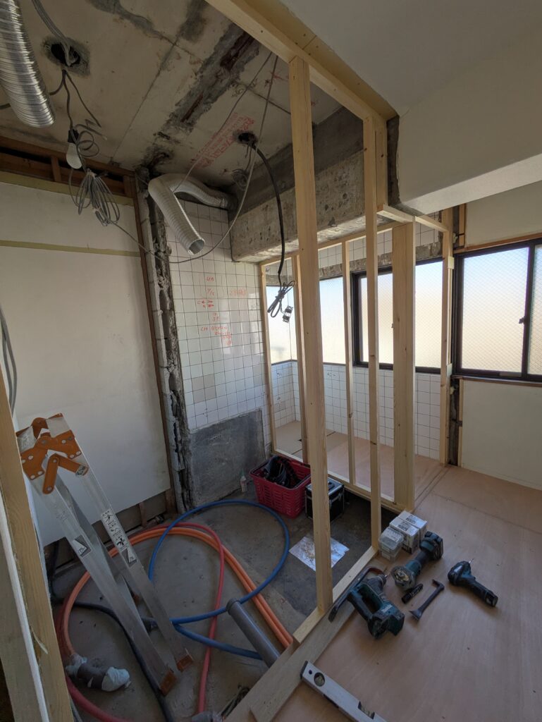 配管作業が終わったので洗面室床、間仕切り壁の軸組を施工しています。