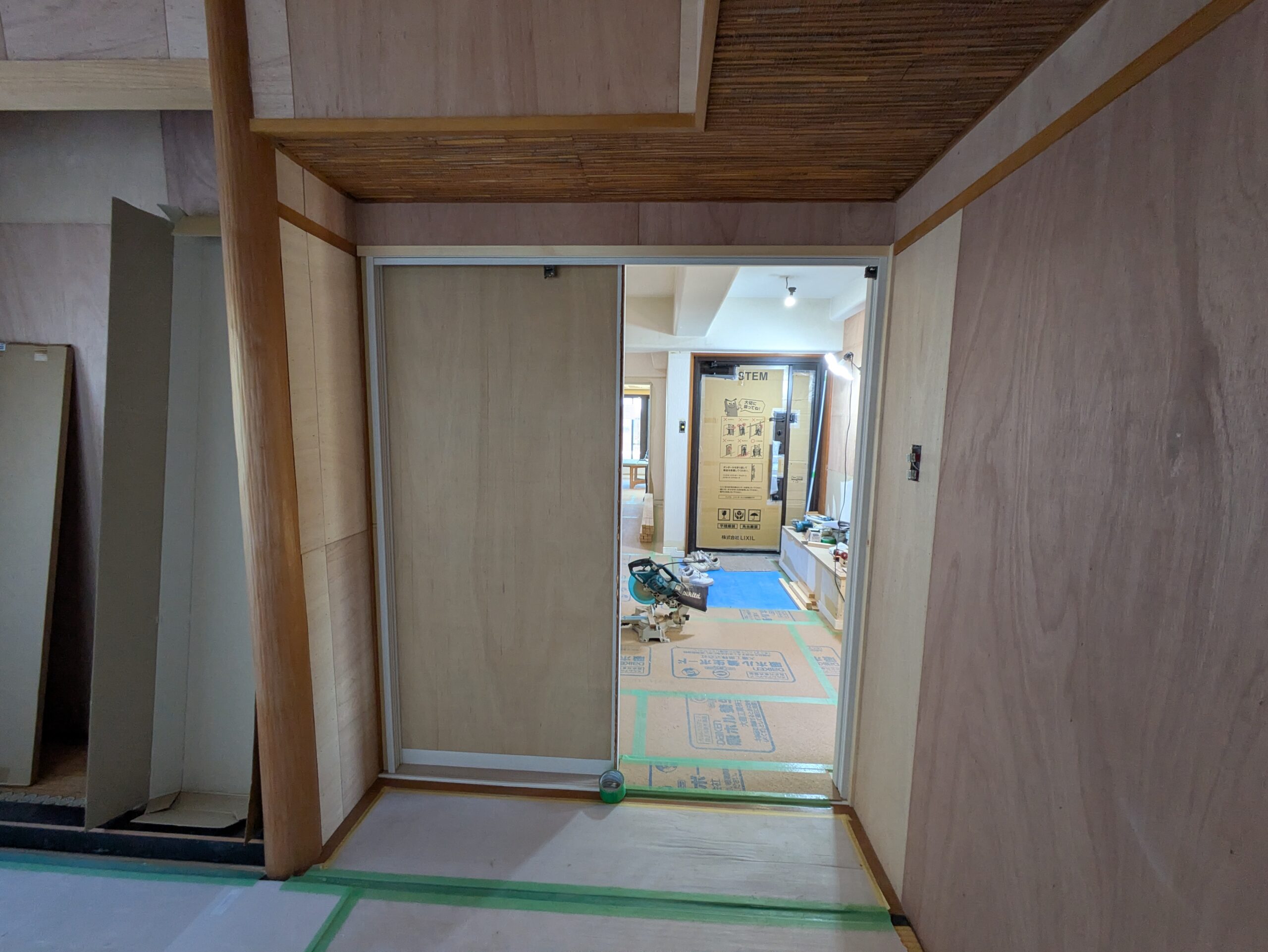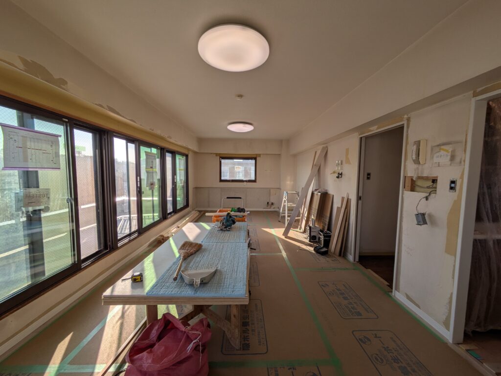 既存床材の上から新しいフローリングを施工しています。(施工後の養生済み)