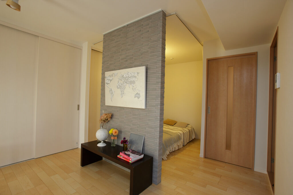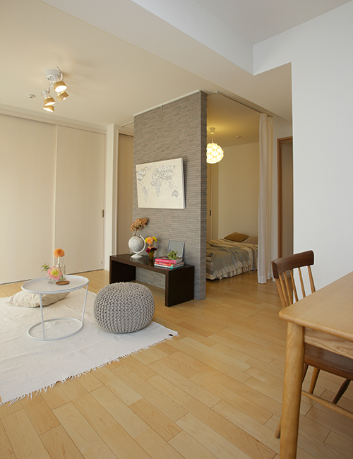 43㎡という限られた広さのため、完全に個室を作ってしまうとリビングが狭く感じられます。そこで、ベッドスペースとリビングをゆるやかに仕切りつつ、アクセントウォールとなる壁を設置しました。