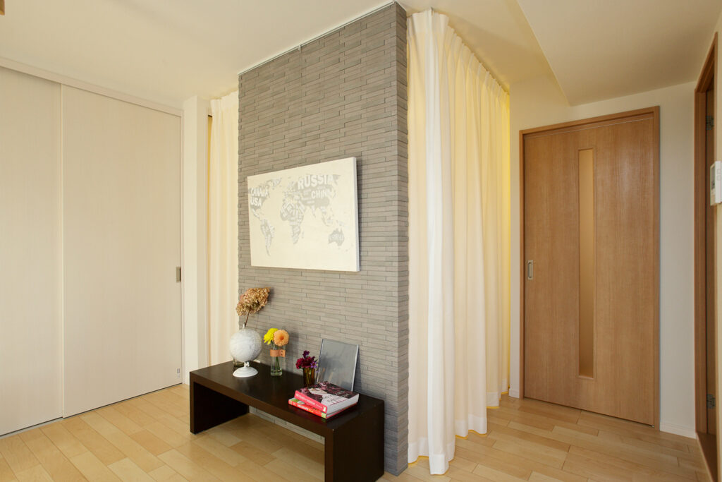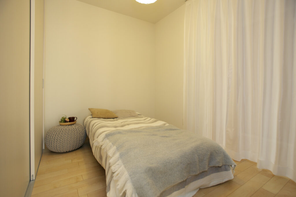 ベッドスペースは来客時にはカーテンで隠すころでプライバシー性も確保。
