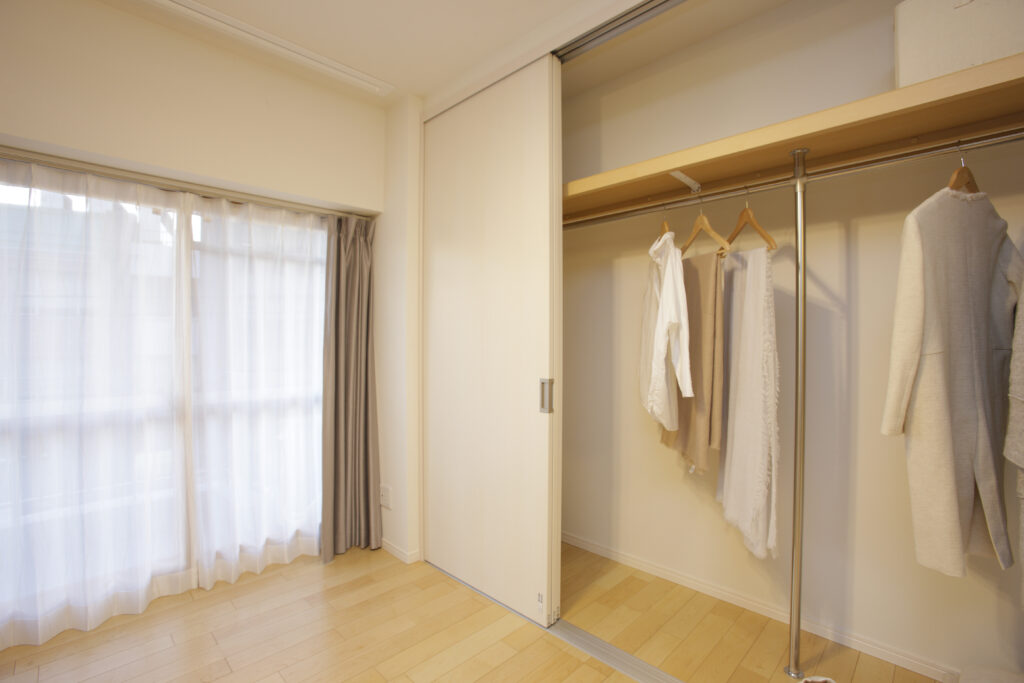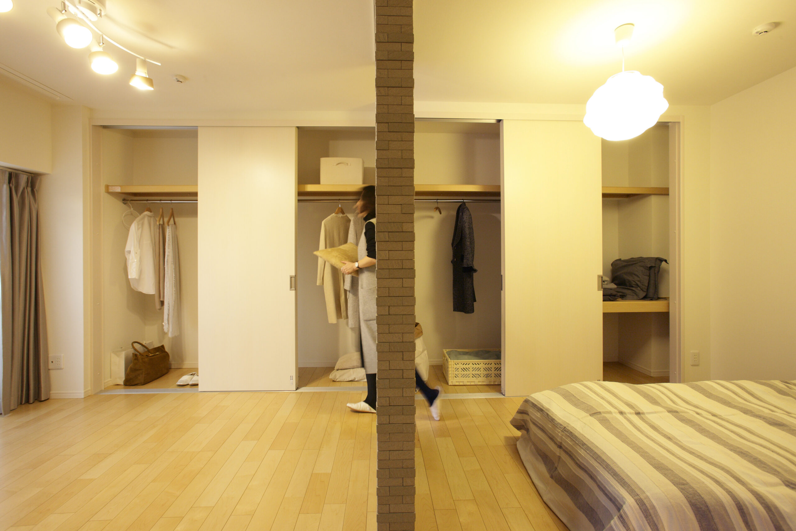 なるべく外に物を出したくなかったため、壁一面にクローゼットを設置し、収納はすべて扉の中にしまえるように。